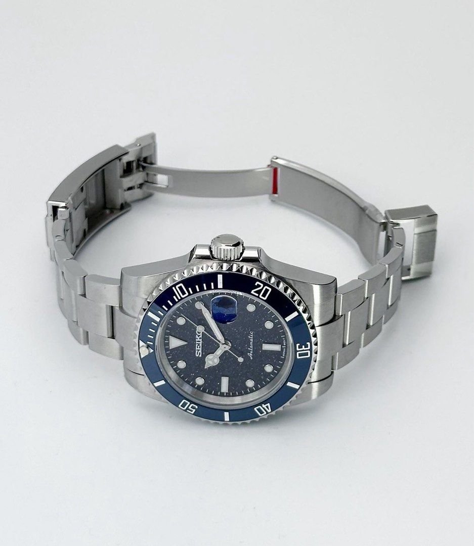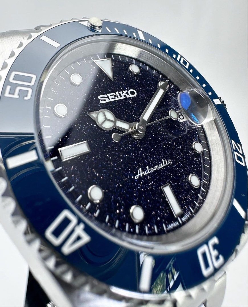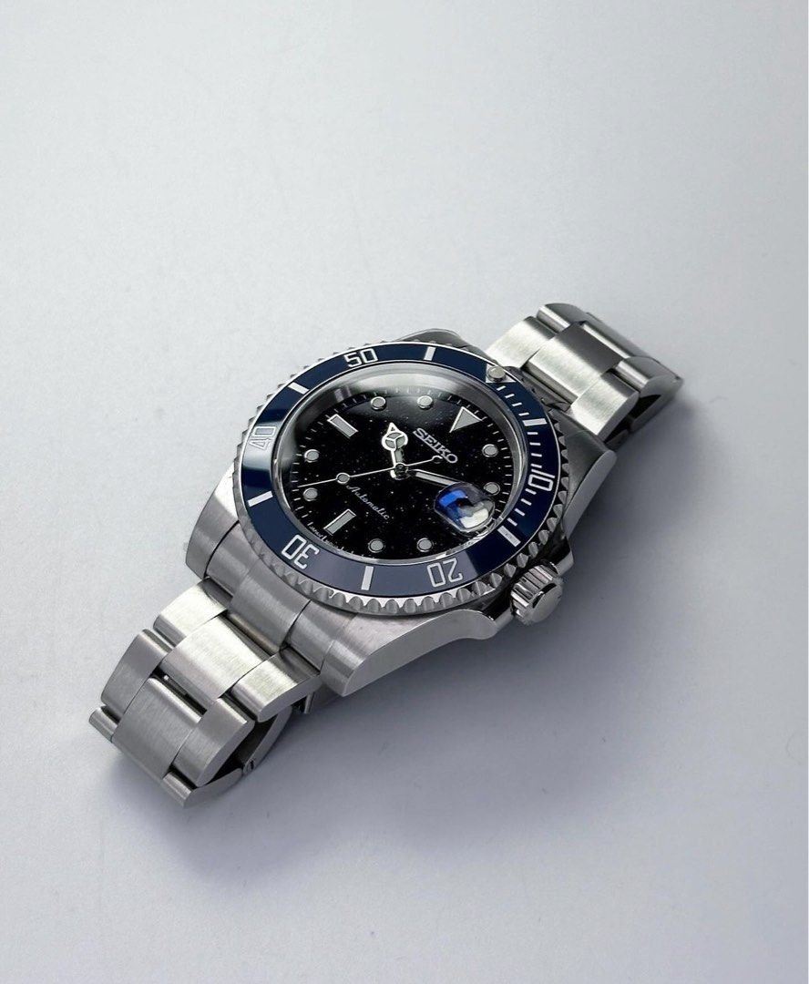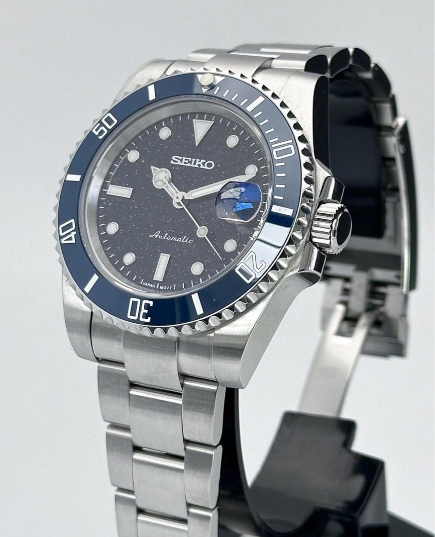 This version features a rotating bezel. screw-down crown and automatic movement with date. Made entirely from stainless steel with a brushed bracelet and diver layout. Available in multiple color variants including two-tone options.