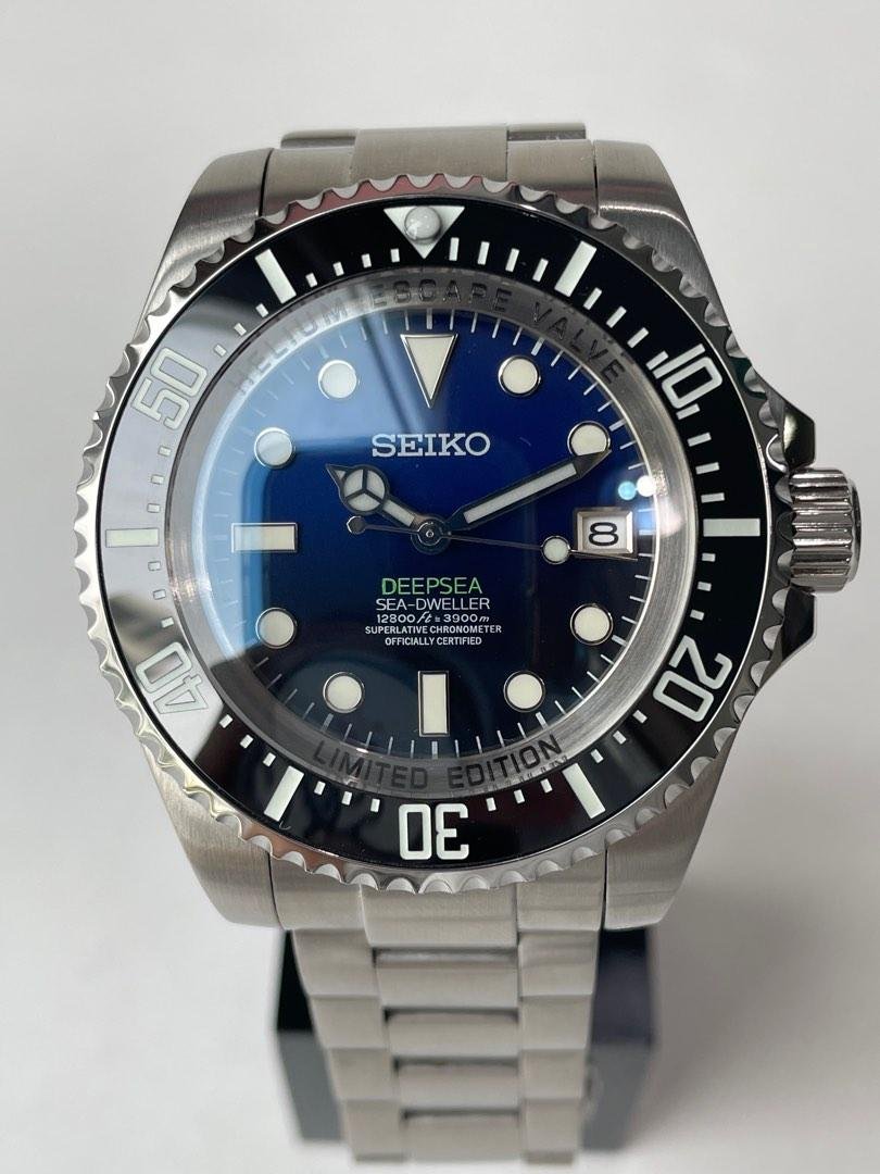 This model comes in a larger 44 mm case and features a dark blue gradient dial with a magnified date window. It includes a diver bezel and thicker proportions compared to other Abyss models.