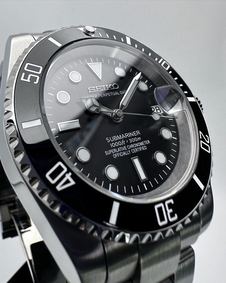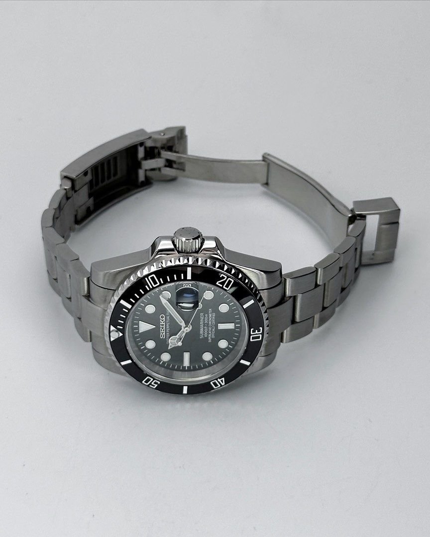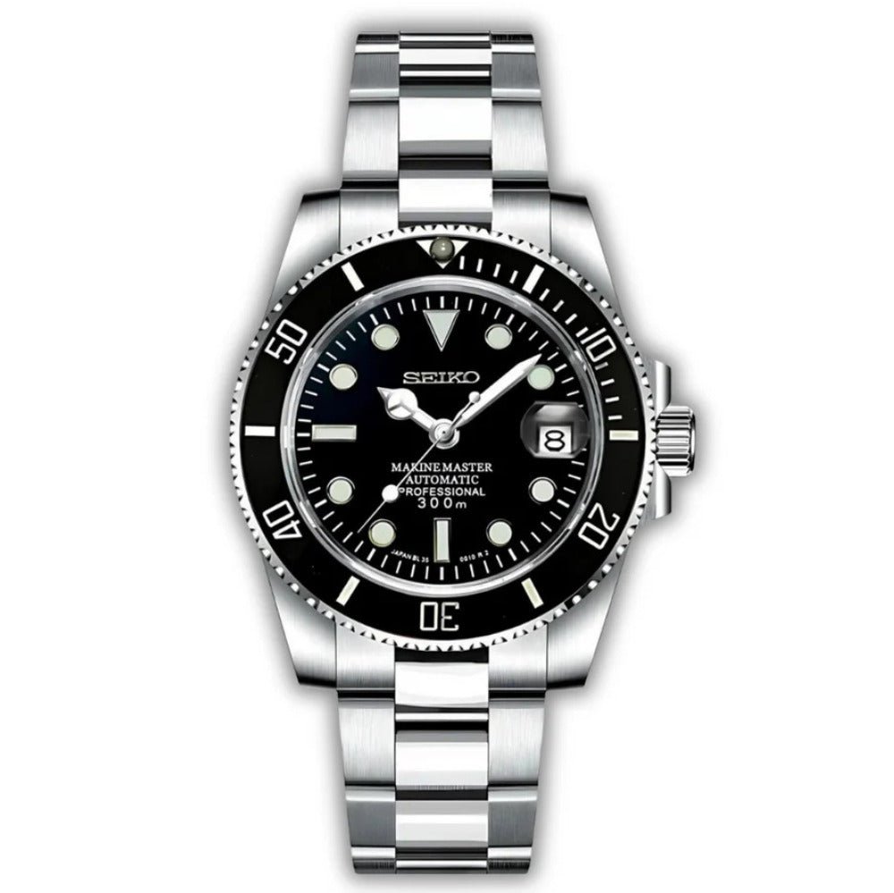 This version features a rotating bezel. screw-down crown and automatic movement with date. Made entirely from stainless steel with a brushed bracelet and diver layout. Available in multiple color variants including two-tone options.