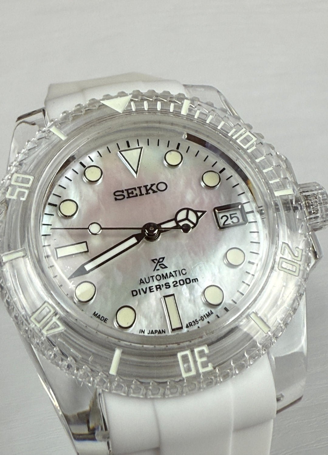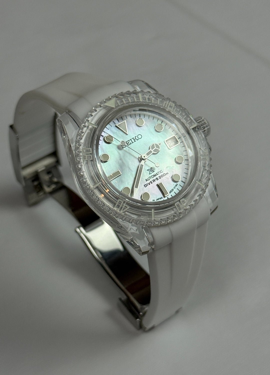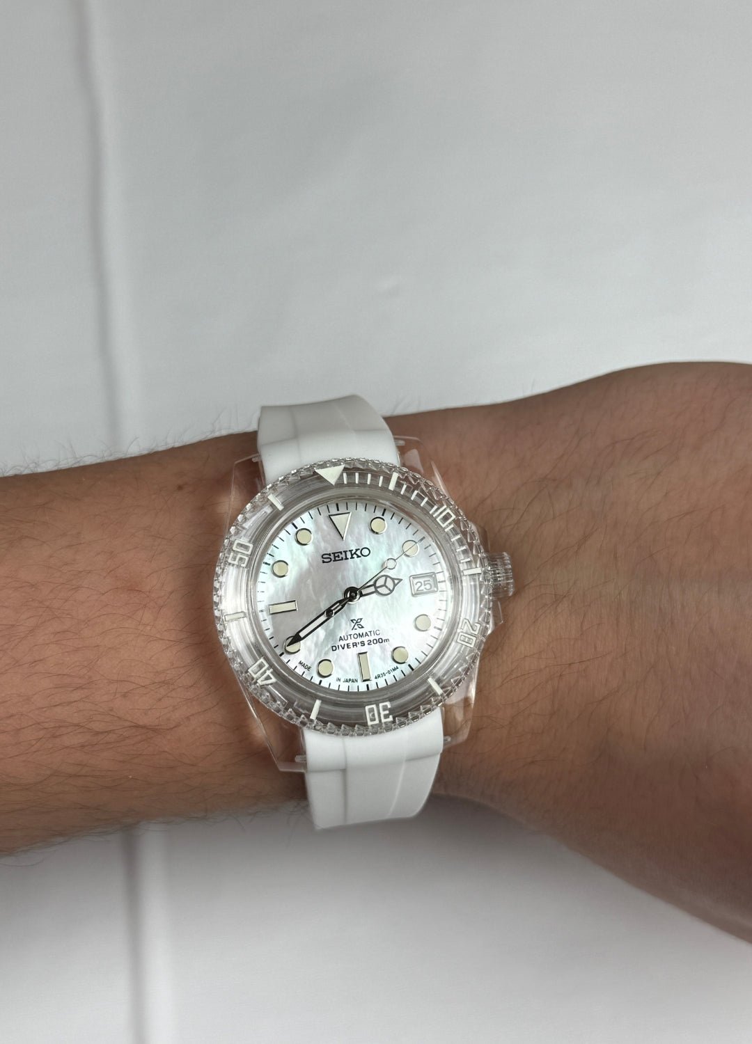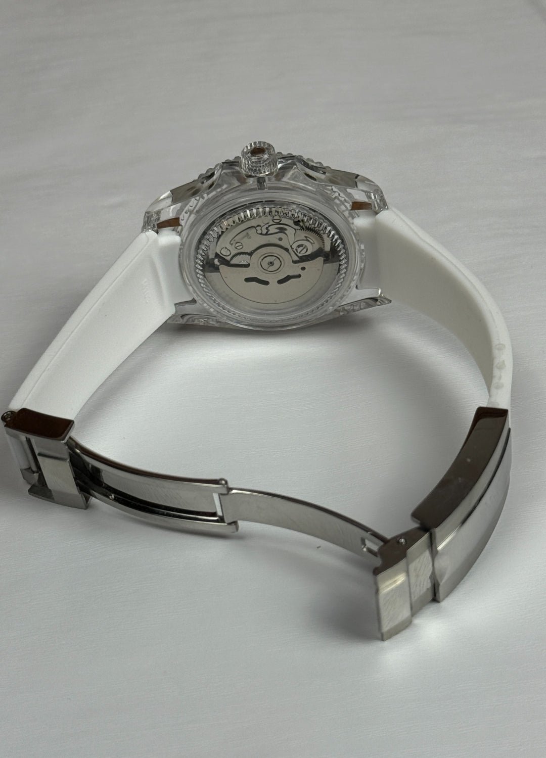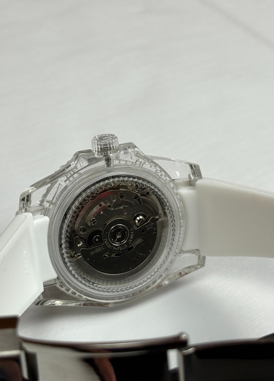 This model features a translucent case with a fully white dial. It runs on a standard automatic movement.