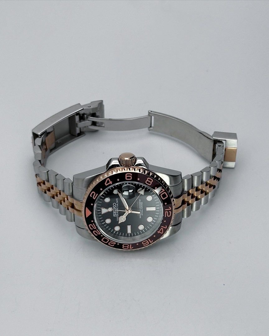 This model includes a rotating 24-hour bezel and a fourth hand for tracking a second time zone. The case is made from solid stainless steel. powered by an automatic GMT movement.