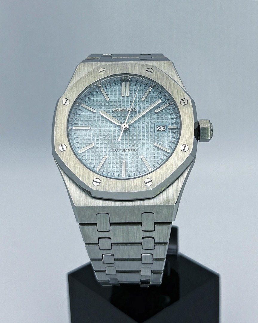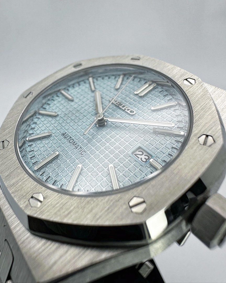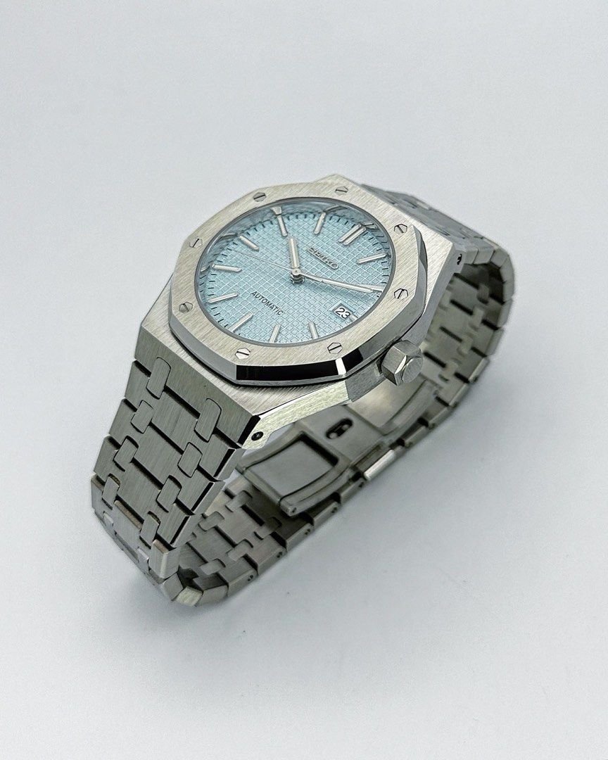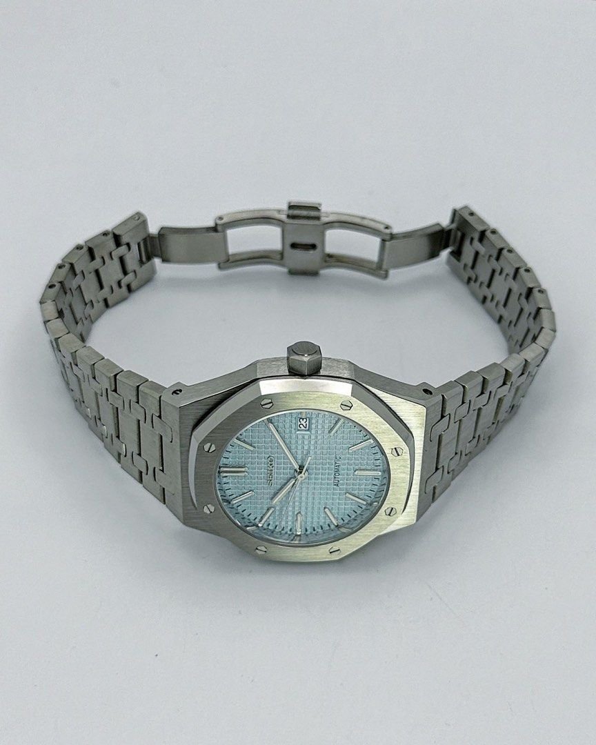 This version features a clean dial layout with a date window at 3 o’clock. The case is brushed on top with polished bevels. paired with a steel bracelet that can be swapped out.