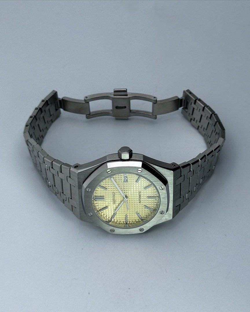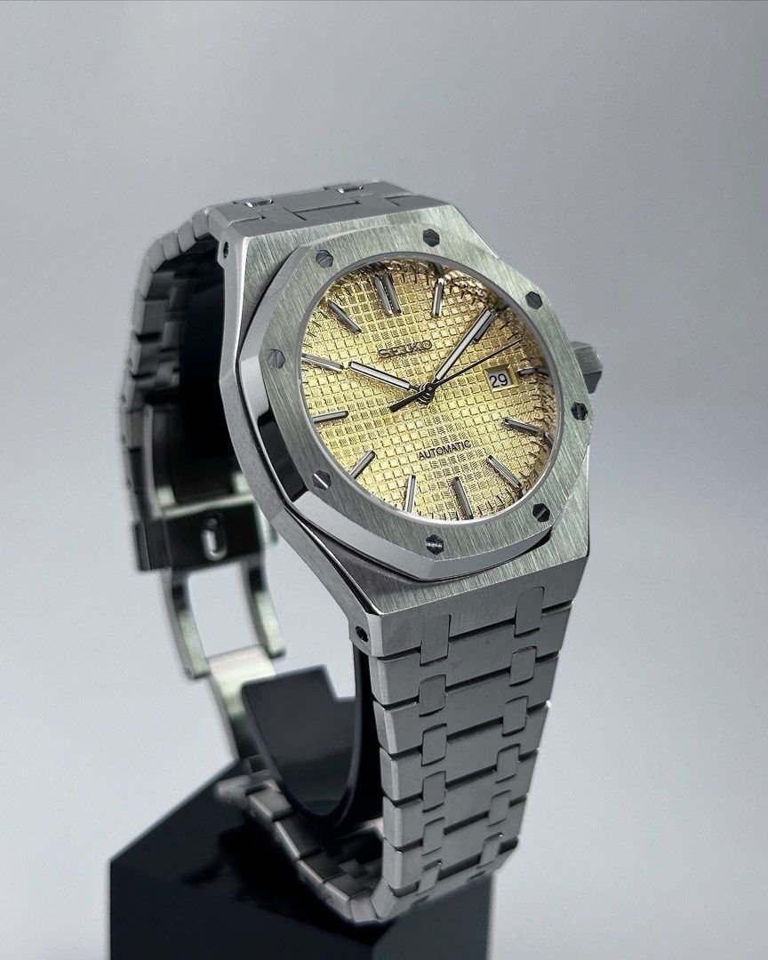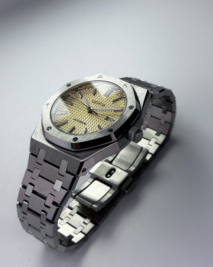 This version features a clean dial layout with a date window at 3 o’clock. The case is brushed on top with polished bevels. paired with a steel bracelet that can be swapped out.