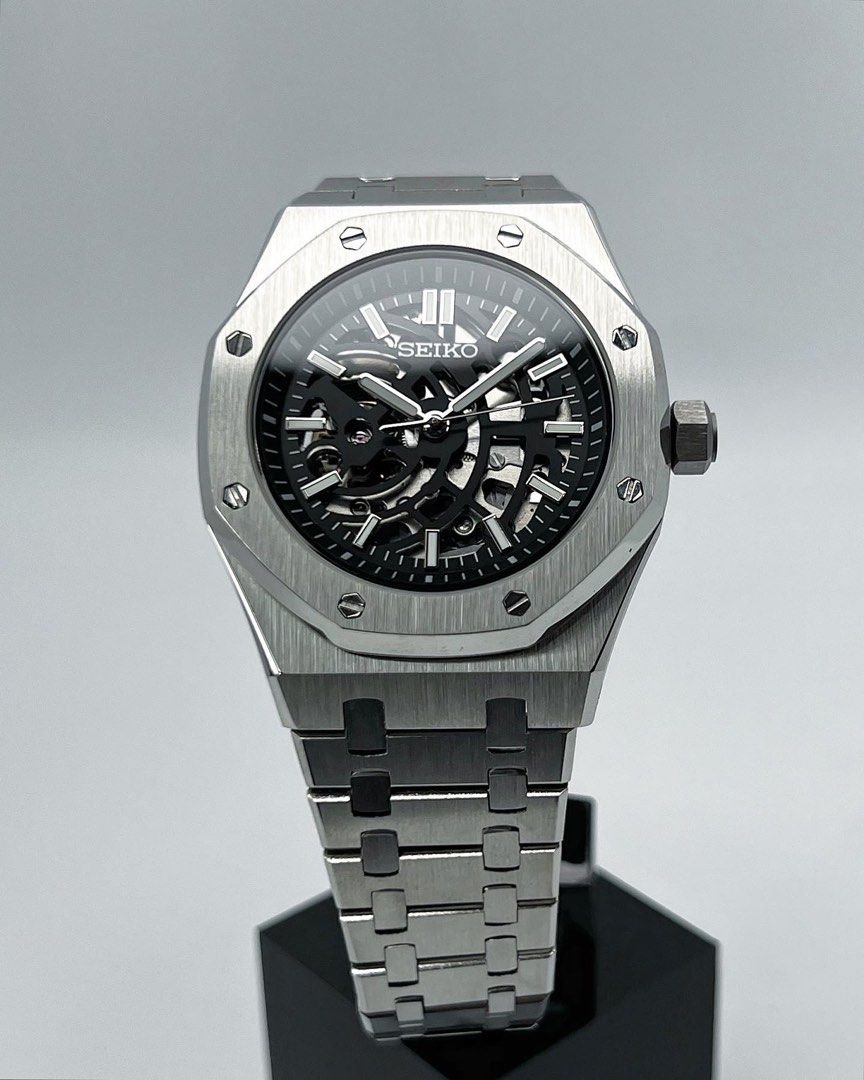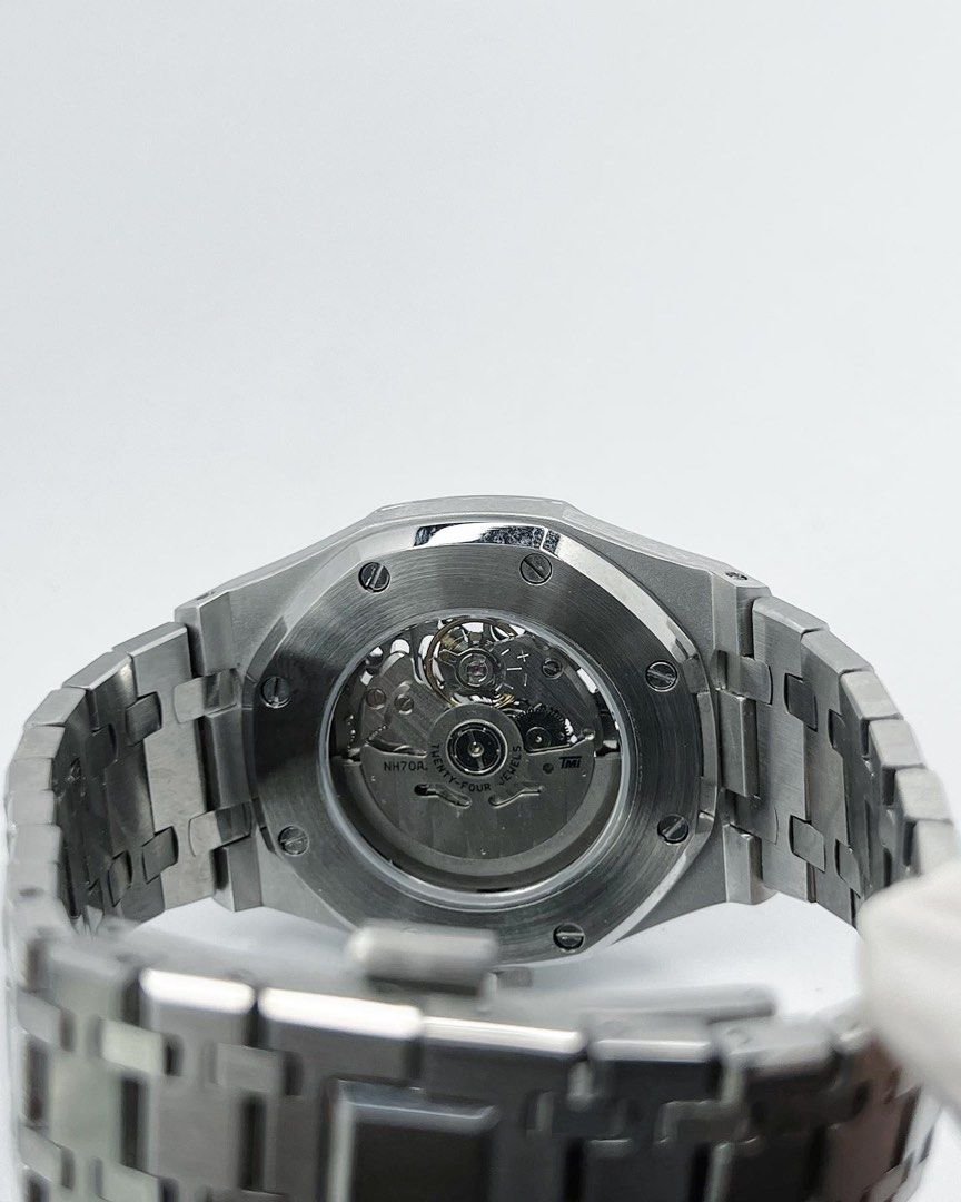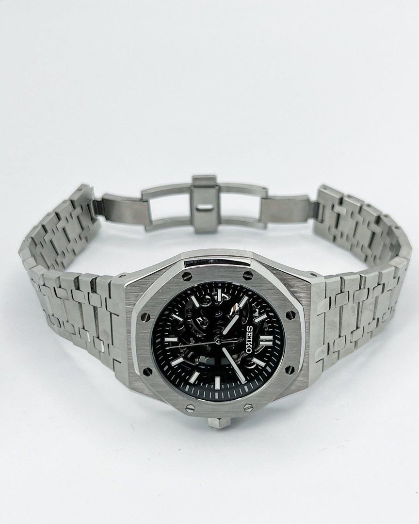 This version features a skeletonized dial showing the movement on the front side. No date function. The bracelet is interchangeable and secured with a butterfly clasp.