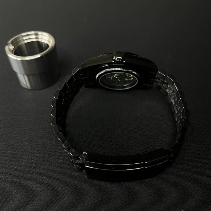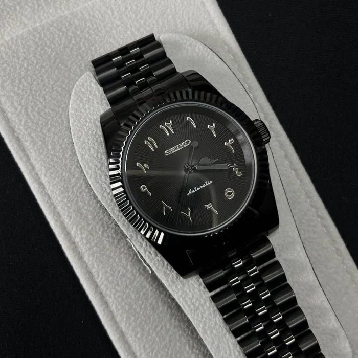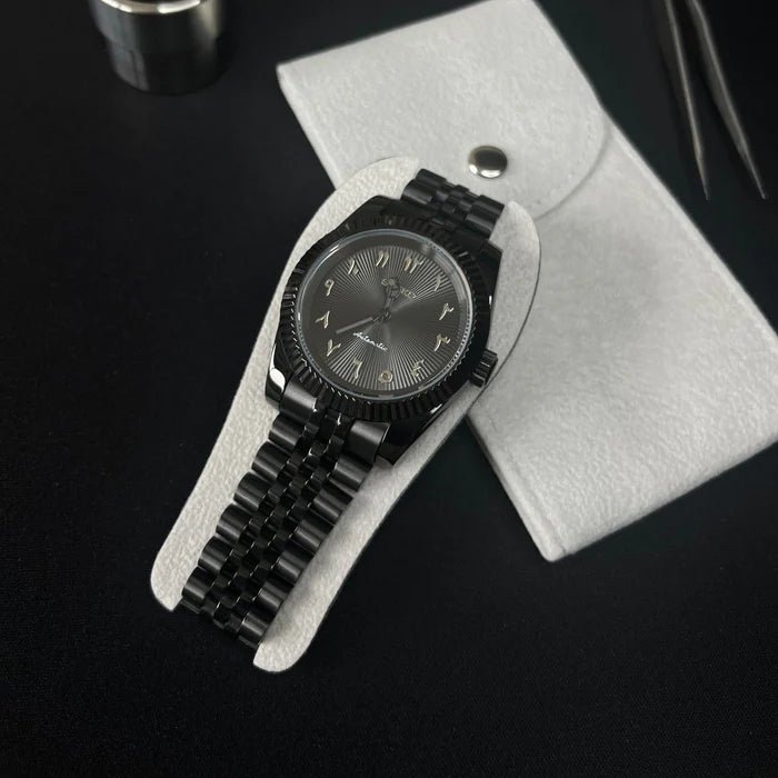 This version is built for simplicity and visual impact. Arabic numerals are engraved into a textured dial with no date window. just a clean face. strong contrast. and smooth automatic movement inside.