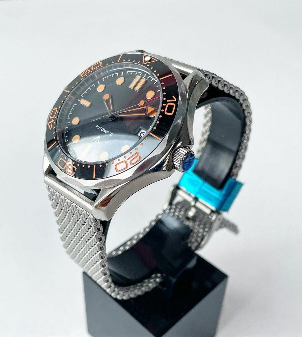 This model features a classic diver-style layout with a date window and rotating bezel. Available in black or brown variants. with either a stainless steel bracelet or mesh strap.