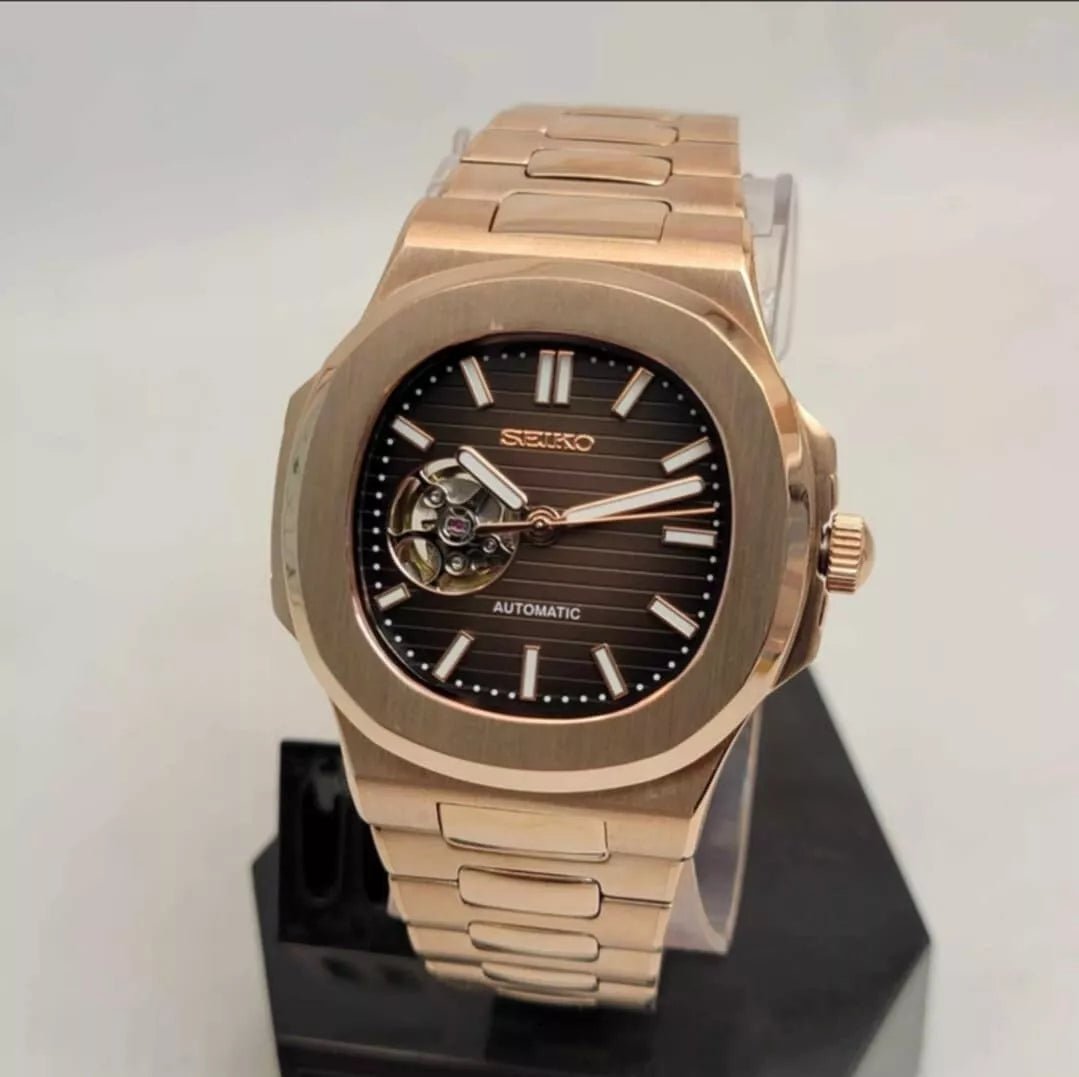 This version features an open-heart dial. showing the movement through a visible window on the front. There is no date window. keeping the layout clean and focused.