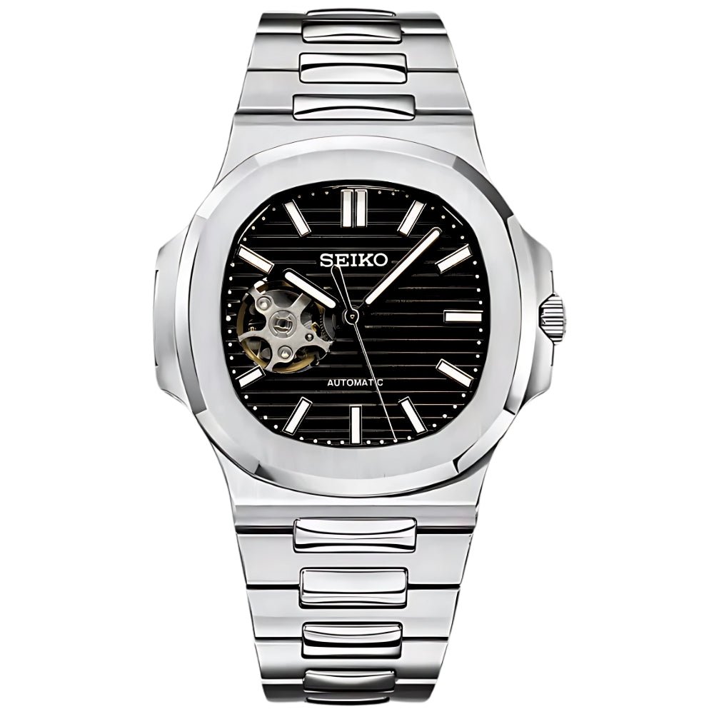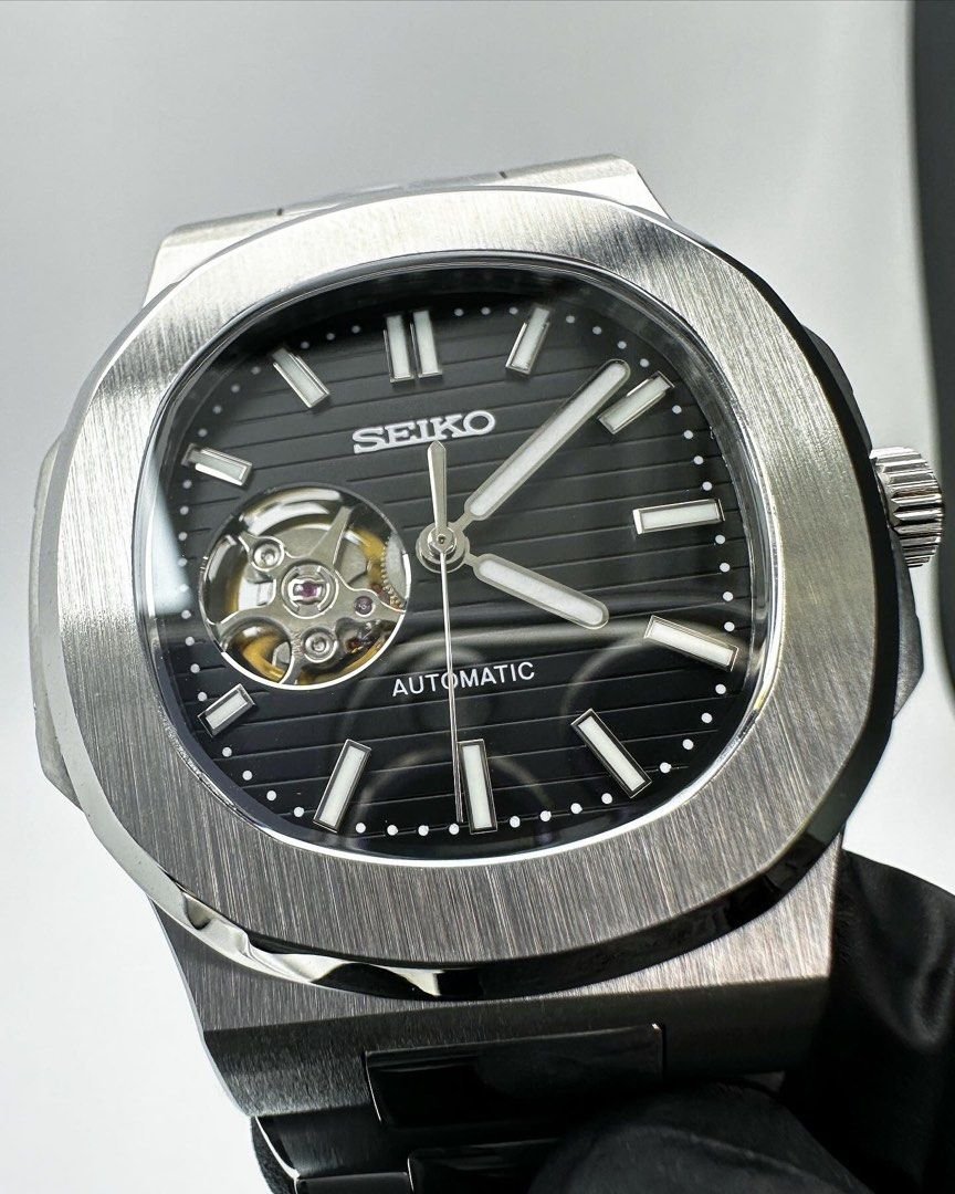 This version features an open-heart dial. showing the movement through a visible window on the front. There is no date window. keeping the layout clean and focused.
