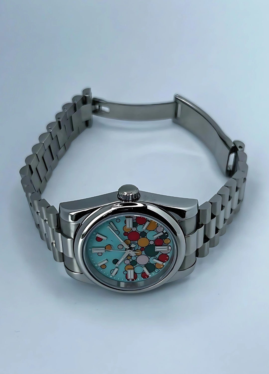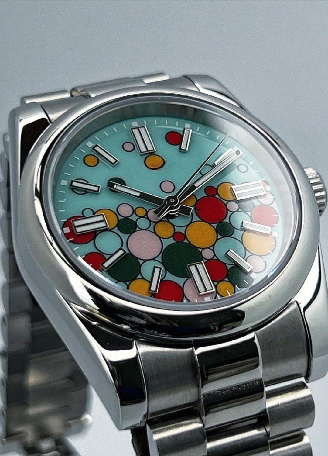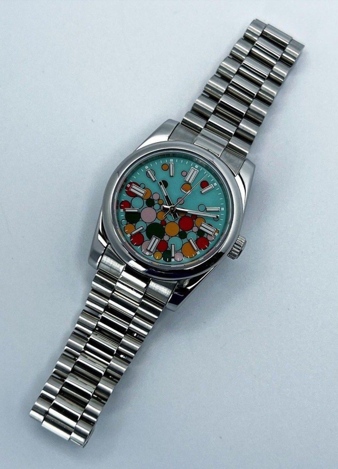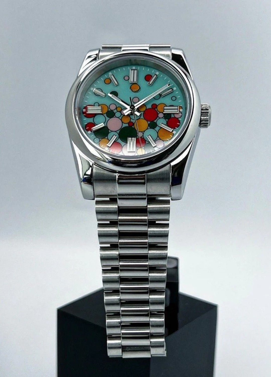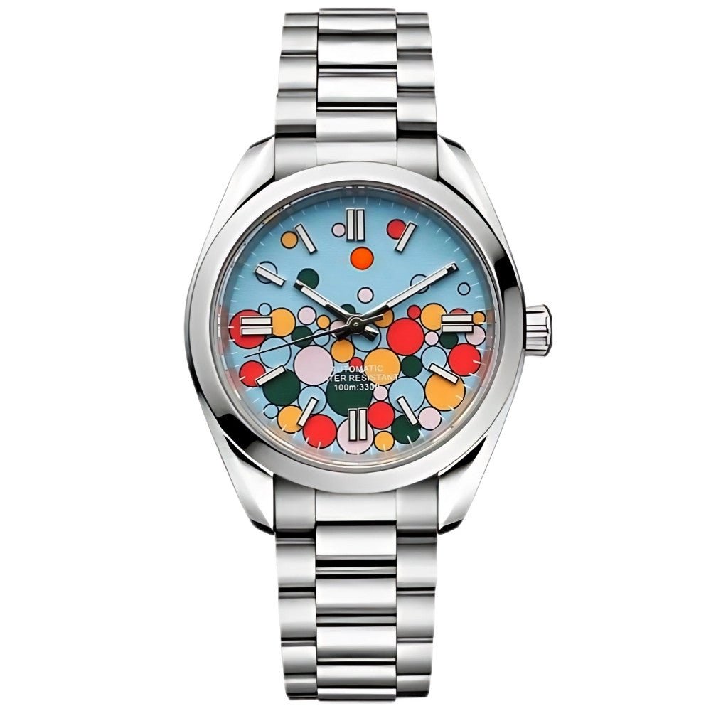 A colourful and playful design with a unique custom dial. Despite the bold artwork. the watch retains full functionality with automatic movement.
