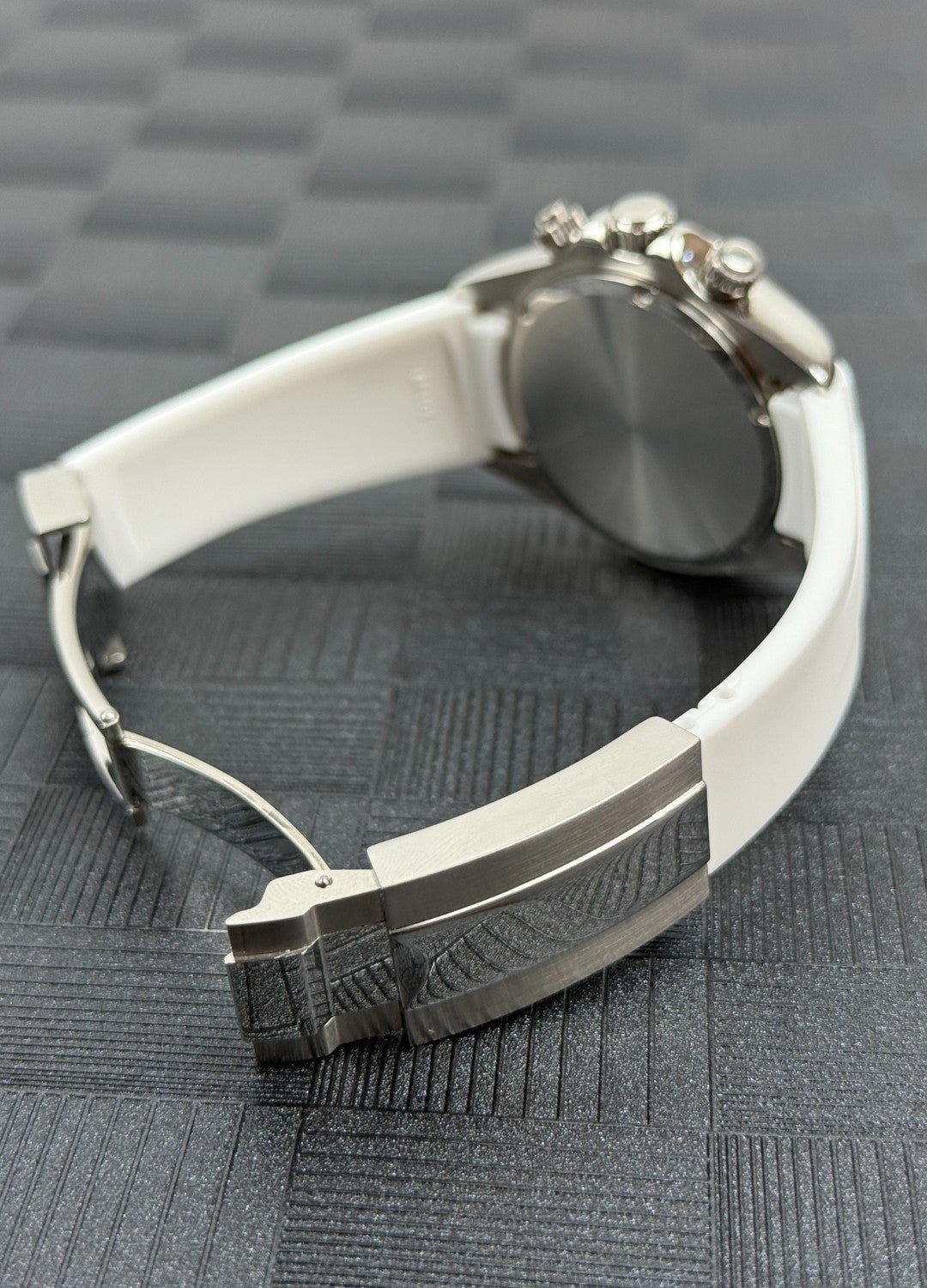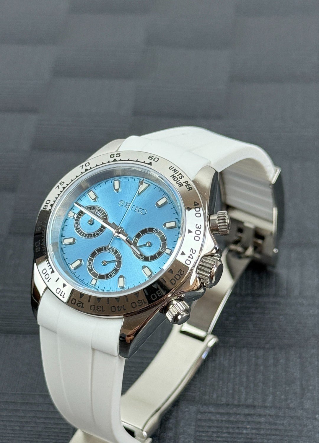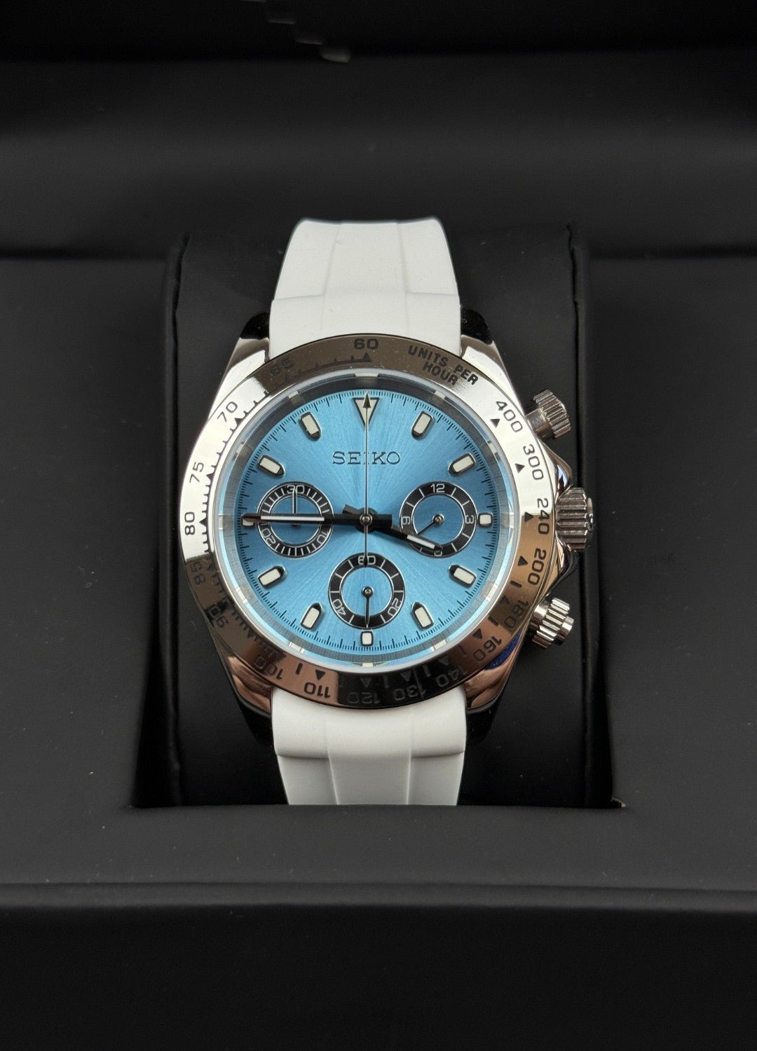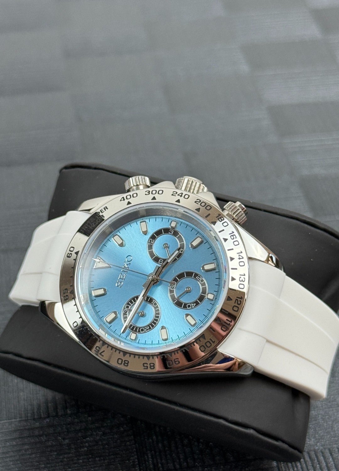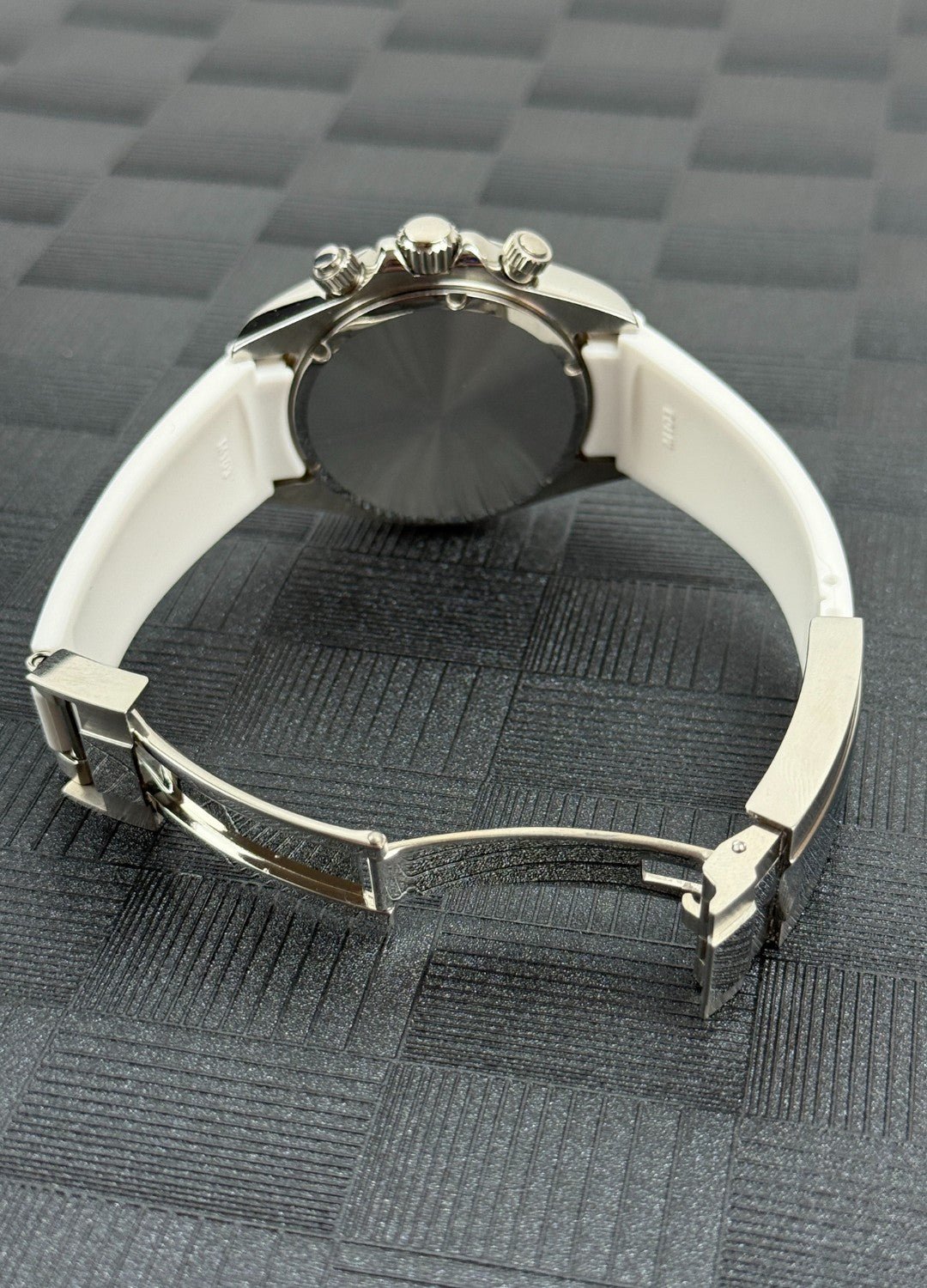 Chronograph with a clean dial layout and three functional subdials. The markers are sharp. the hands are high-contrast. and the case finish brings together brushed and polished surfaces. Ideal if you’re after a daily watch that doesn’t scream for attention but still delivers presence.