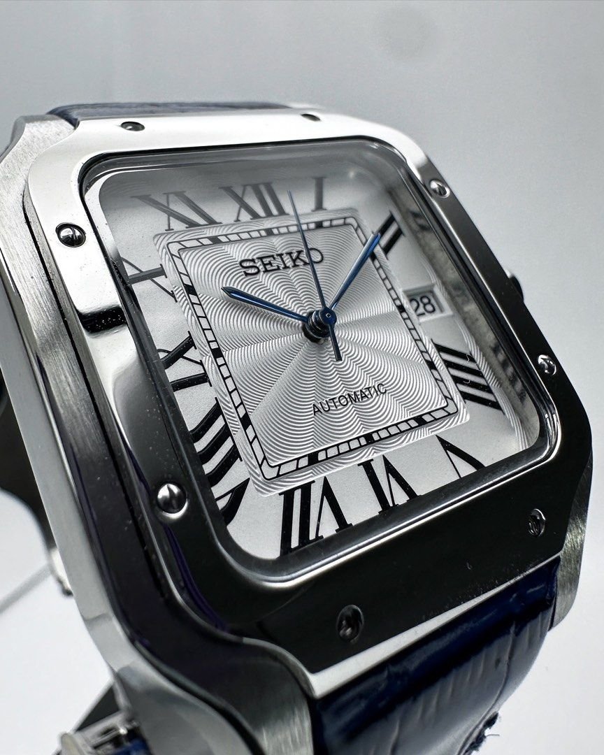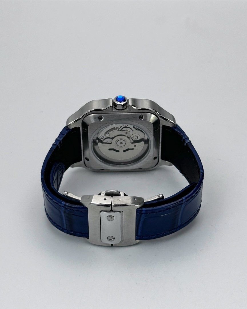 The same setup as the steel bracelet model. just paired with a leather strap for a more relaxed or formal look. Still automatic. still compact. just with a softer wrist feel.